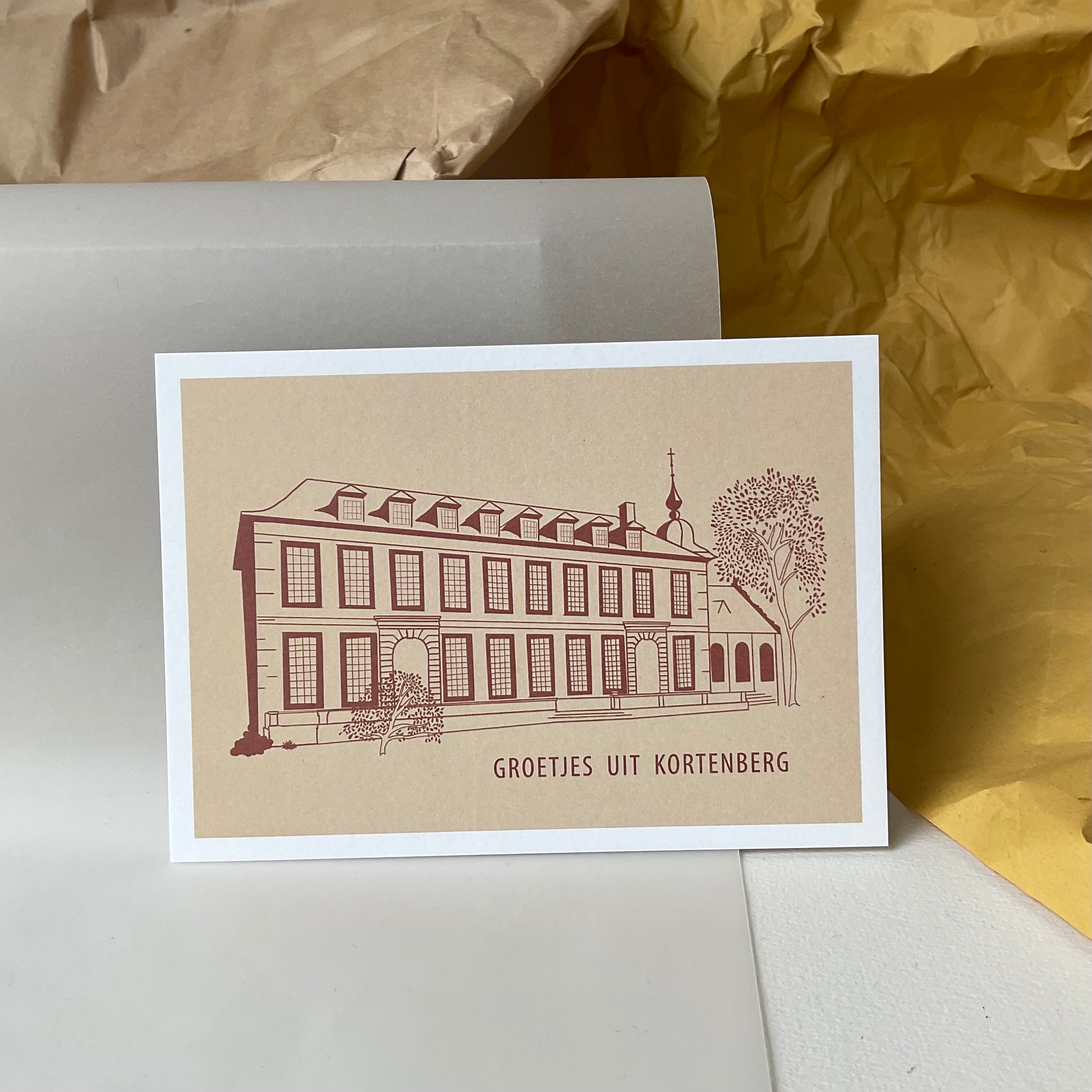 Een postkaart met kraft enveloppe. De wenskaart van Kortenberg. De lijntekening is 1 van de mooiste gebouwen in Kortenberg, de Oude Abdij van Kortenberg. Op bezoek in Kortenberg? Dan moet je het park van de OAK gezien hebben! Groetjes uit Kortenberg ✌️