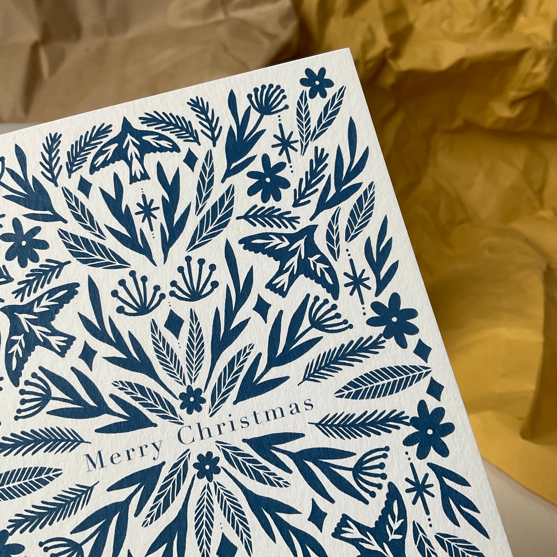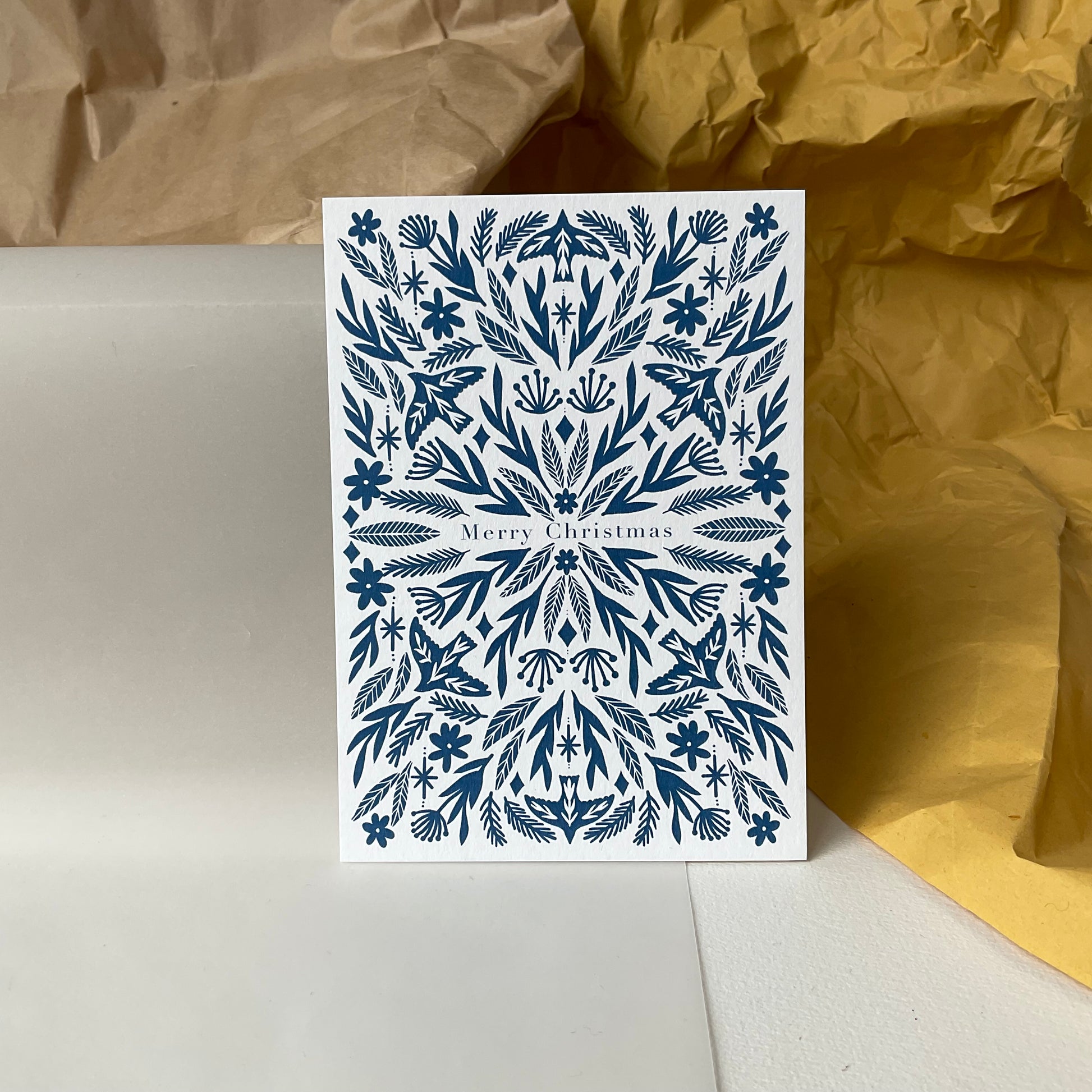 Een kerstkaart met kraft enveloppe. 💌 Donkerblauwe symmetrische silhouttekening met vogels, planten, sterren en bloemen. Merry Christmas!Â