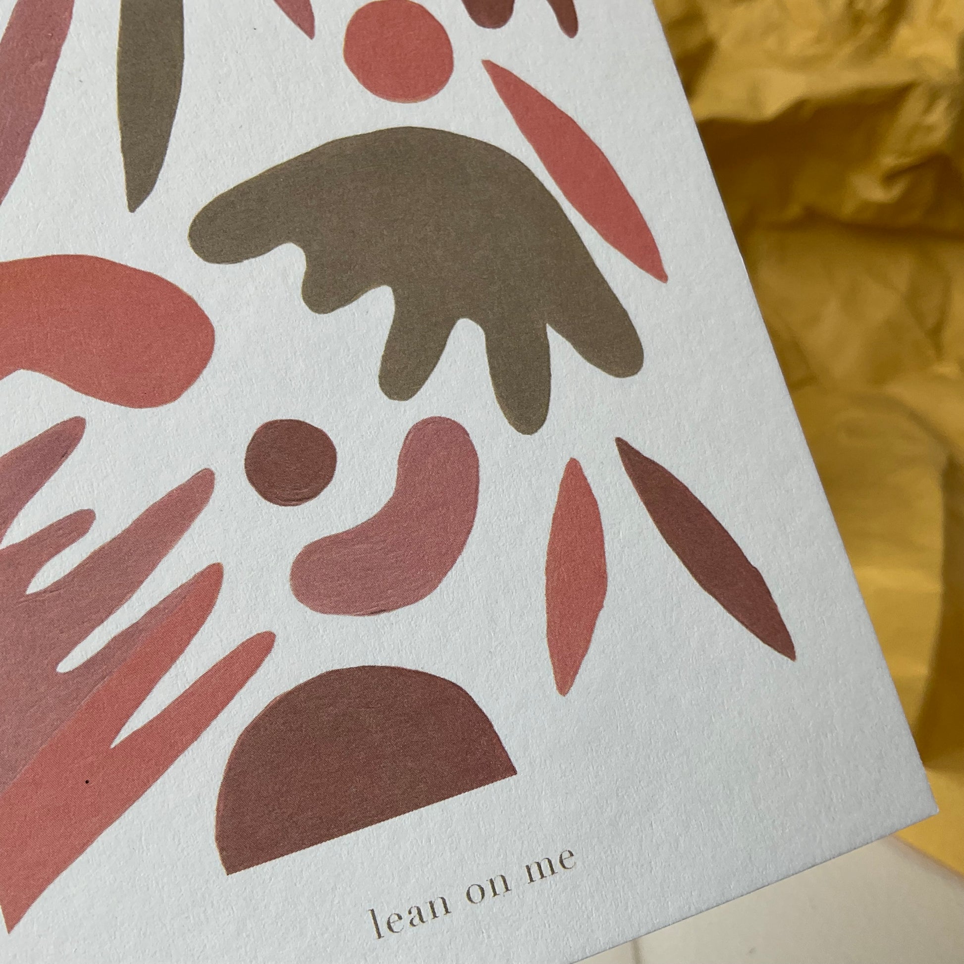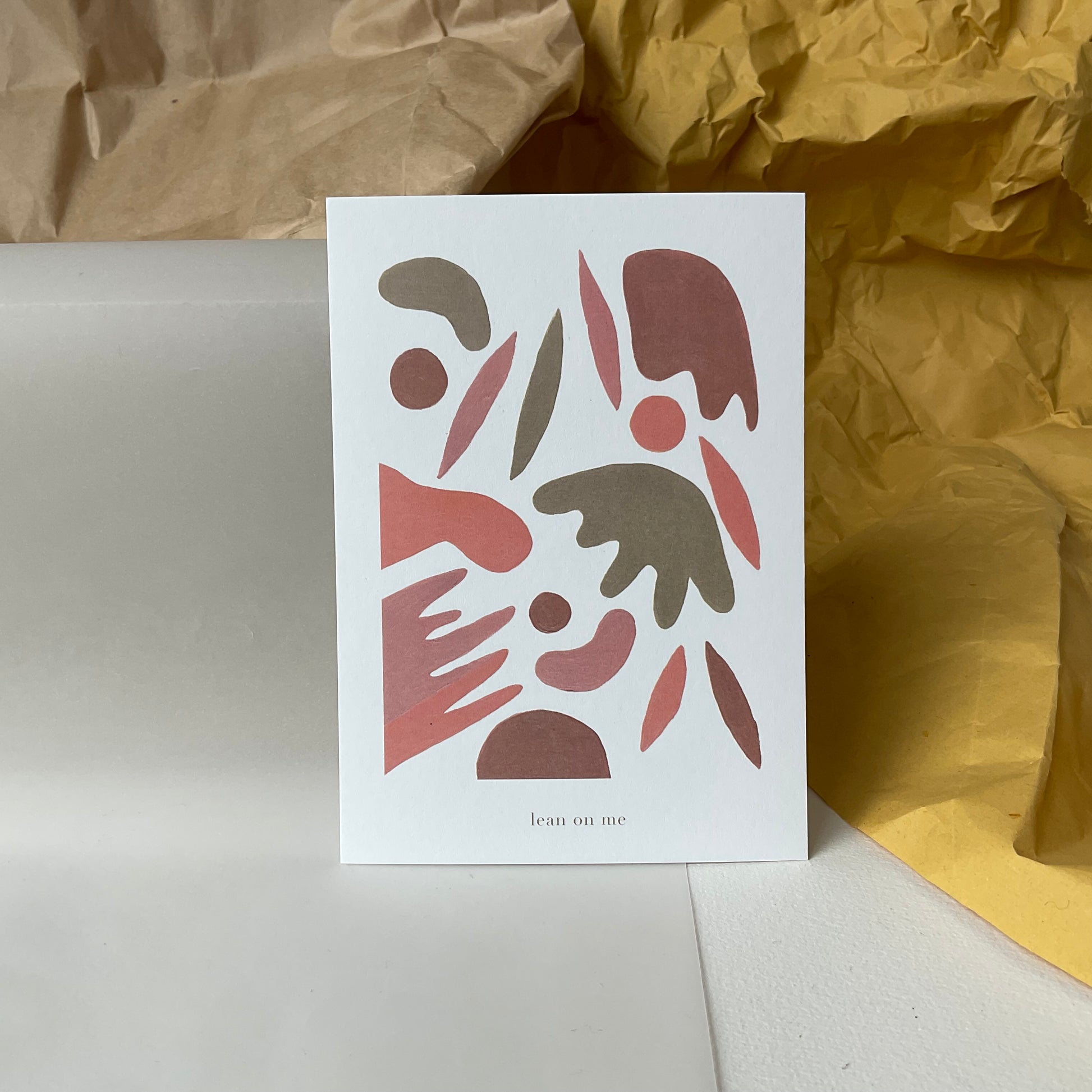 Een postkaart met kraft enveloppe. Soms is het nodig om iemand te laten weten dat je er bent, en dat ze op je kunnen steunen. Lean on me is een kaart die je hiervoor kan gebruiken. Het is ook een prachtig liedje🎵