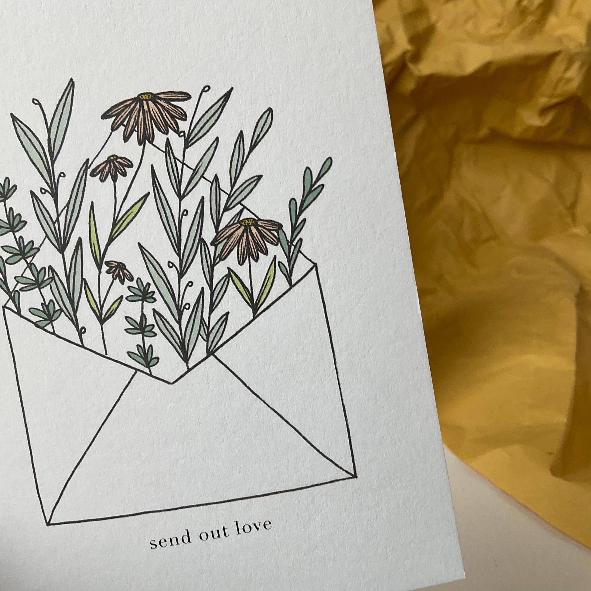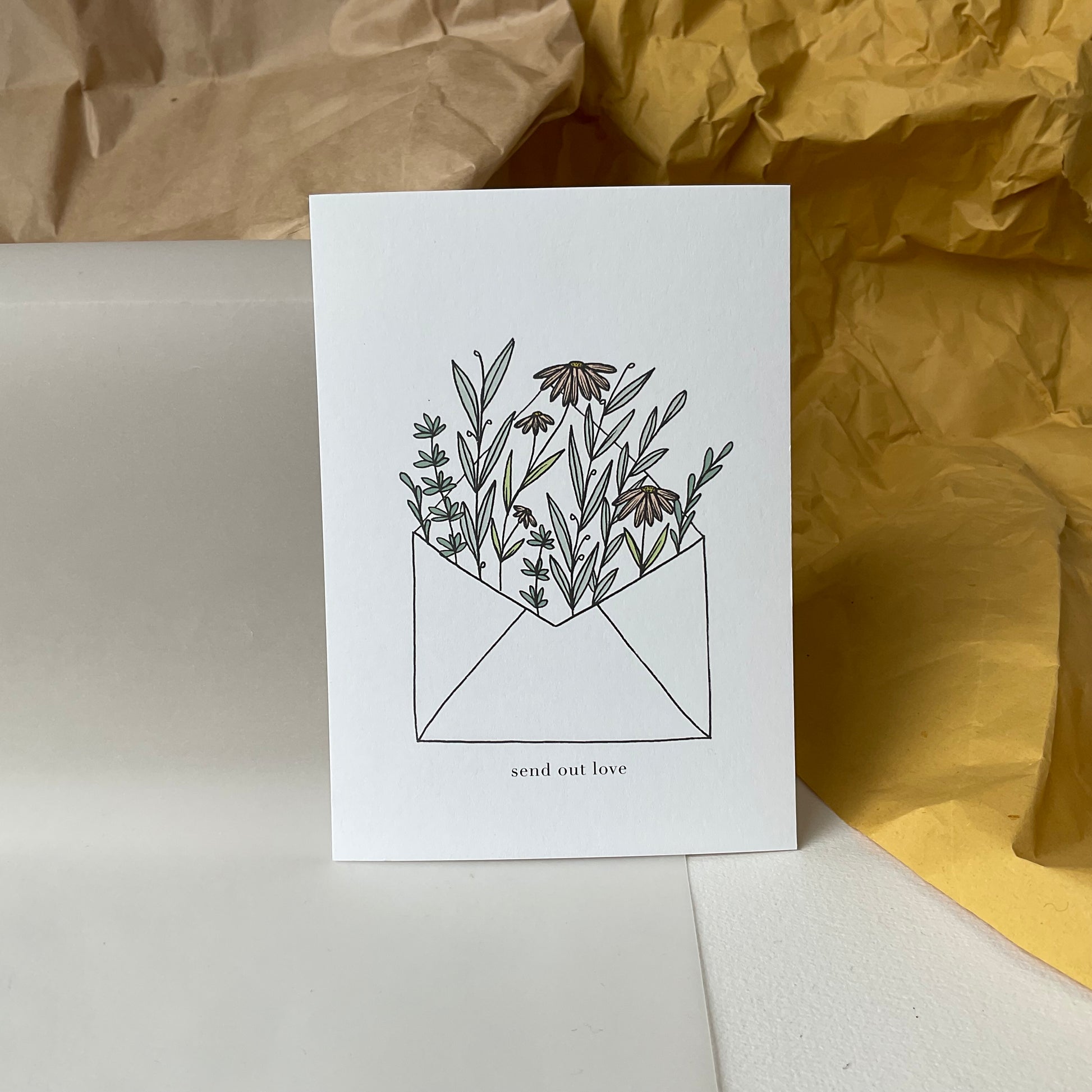 Een postkaart met kraft enveloppe. Send out love, een boodschap die we allemaal wat vaker mogen versturen. 🫶