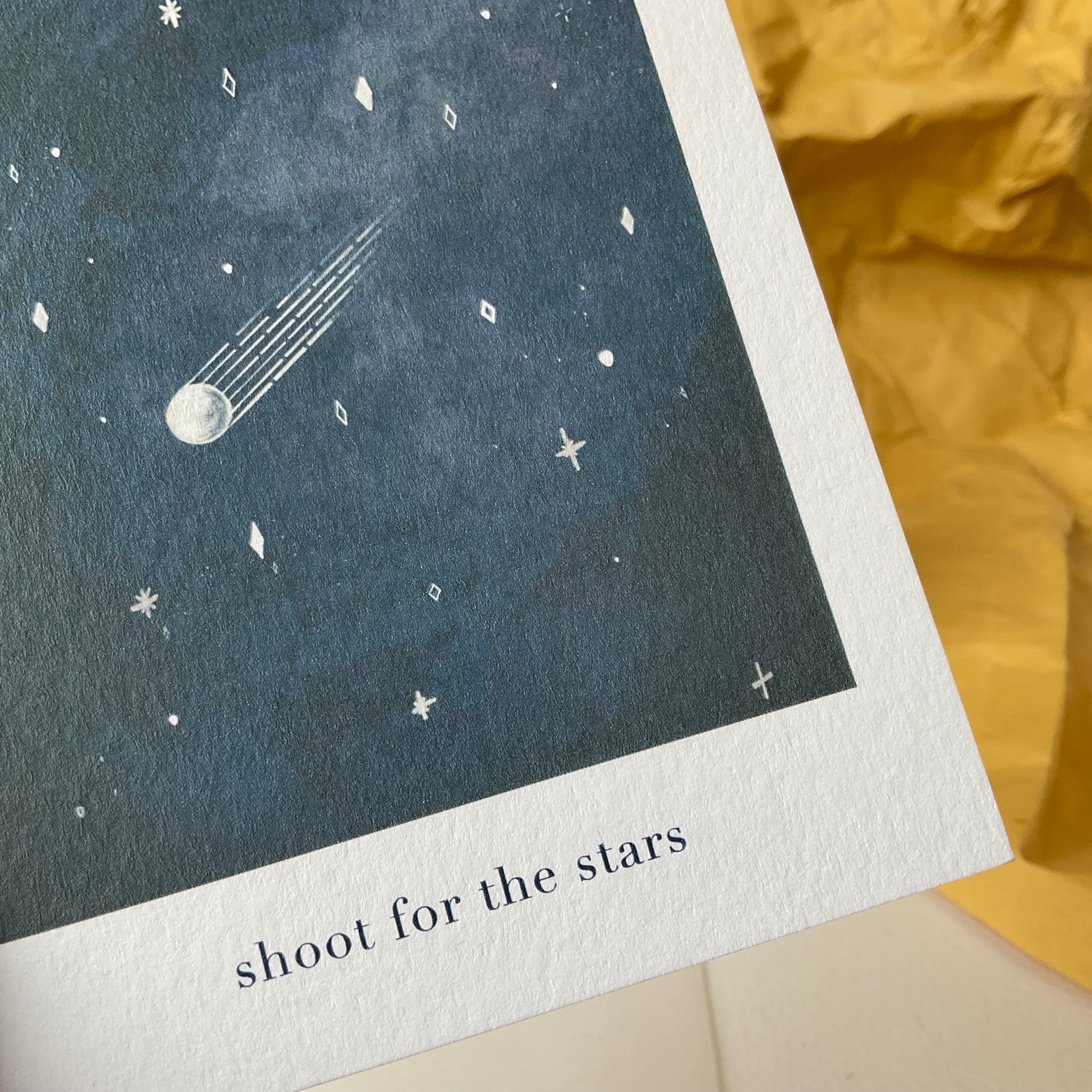 Een postkaart met kraft enveloppe. Shoot for the stars, blijf dromen, blijven proberen, geloof in jezelf, mogen al je wensen uitkomen … een WENSkaart zoals hij hoort! 💫