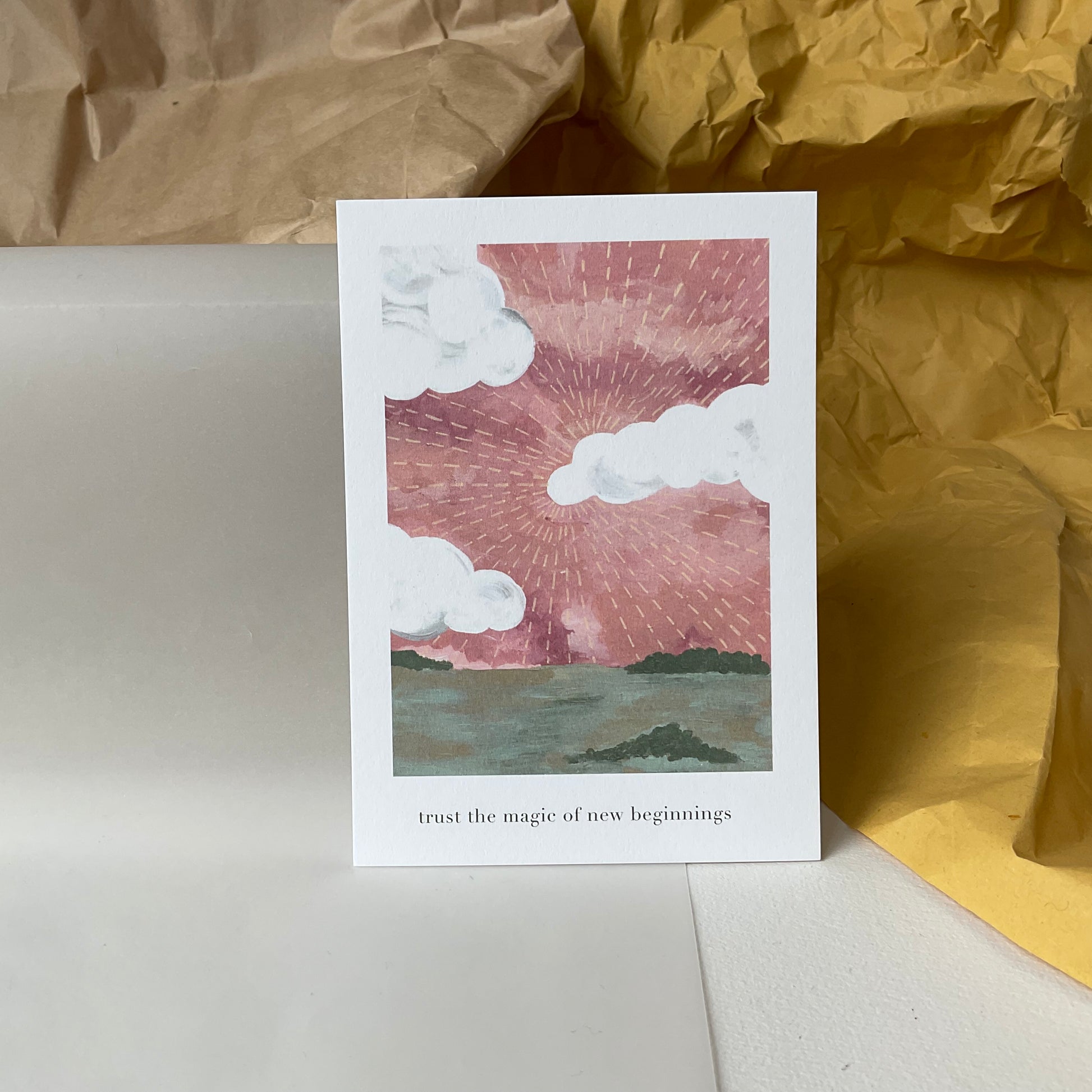 Een postkaart met kraft enveloppe. Een kaart met een boodschap. De afbeelding is een schilderij van een landschap met roze lucht. Roze lucht spreekt tot de verbeelding. Vandaar dat ik er een schilderij van maakte. De boodschap trust the magic of new beginnings past er naadloos bij. 1 van mijn favorieten ❤️