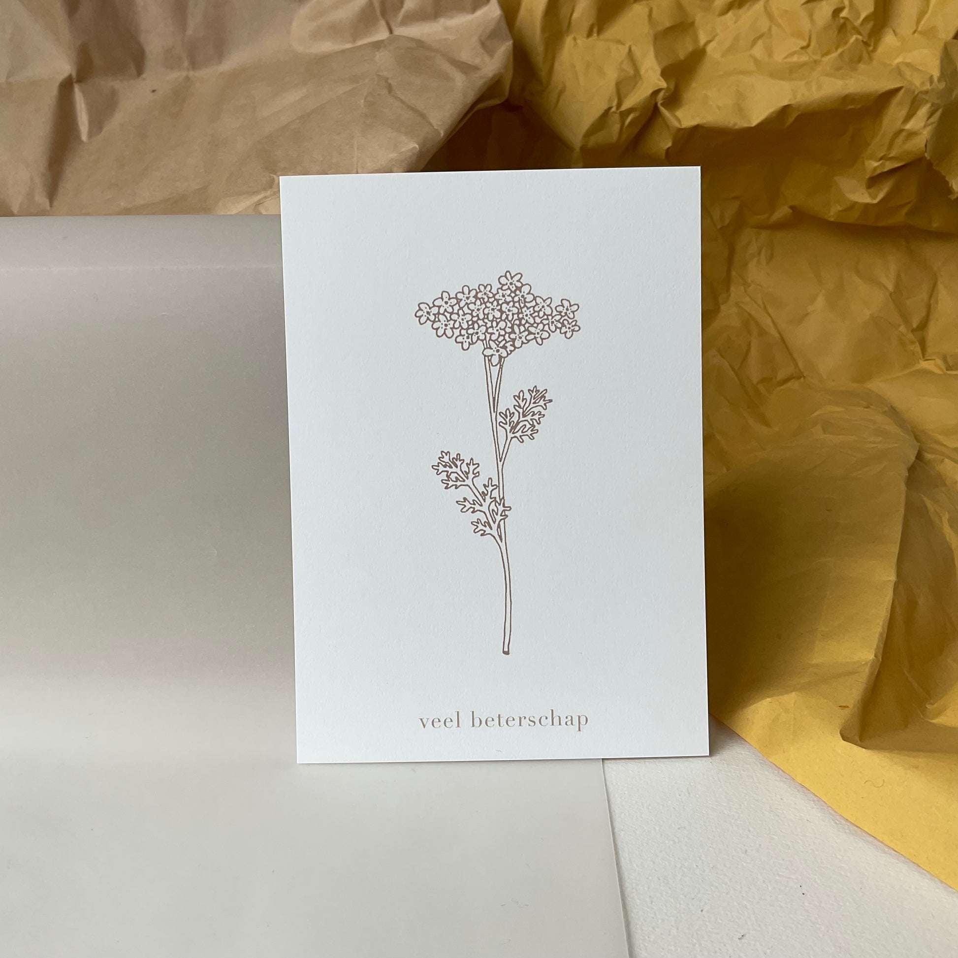 Een postkaart met kraft enveloppe. Veel beterschap! Met dit kaartje kan je iemand beterschap wensen en wat steun tijdens een stomme periode.